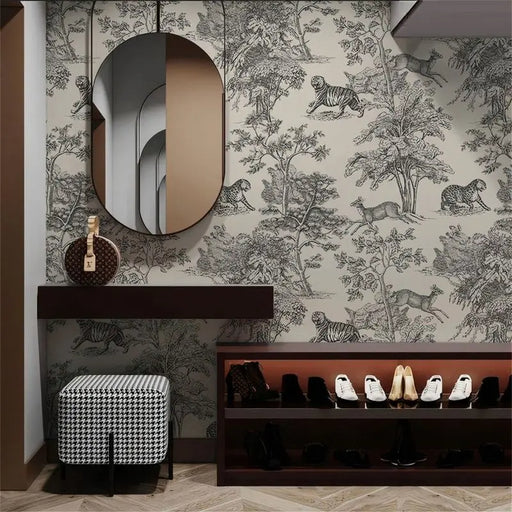 View full detailsThis white line jungle wallpaper depicts tigers, cheetahs, and spirit deer with delicate brushstrokes, hidden among dense branches and leaves. The ...